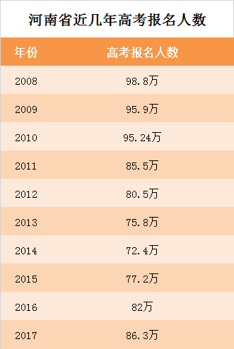 新浪教育讯 据映象网报道,河南省招生办公室召开2018年全省普通高校招生宣传工作新闻通气会。记者在现场获悉,2018年河南省高考人数98.38万人,猛增12万。其中全国统考人数77.94万人,创历史新高。对口升学9.45万人,专升本人数10.99万人。 从往年数据来看,河南高考人数常居全国第一,多次逼近百万。2008年,河南高考报名人数有98.8万人,创历史新高。之后几年持续下降,2009年有95.9万人,2010年有95.24万人,2011年有85.5万人,2012年有80.5万人。高考报名人数的下滑,不仅在河南省出现,在全国也是如此。适龄考生人数的自然减少是造成报考人数下滑的主要原因之一。近三年来,河南高考报名人数一直呈稳定上涨趋势。(点击查看各省市近年高考人数)