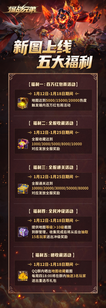 【天降百万红包雨,五大福利爆战开启】 1月12日上线首日,五大超级福利惊喜来袭。地图达到指定热度,KK对战平台将下起“百万红包雨”,呼朋唤友加入游戏,降雨概率100%!还有全服收藏和全服通关活动,全服奖励拿到手软;收藏地图晒一晒,海量奖励轻松入手;更有地图冲级活动,将有机会赢取神秘冲级大奖。