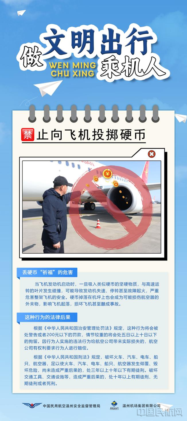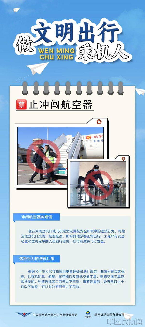 《中国民航报》、中国民航网 记者赵瑜 通讯员何思扬、汪润其 报道:2024年春运已经拉开帷幕,许多旅客早已收拾好行囊,迫不及待地加入春运大潮,这是千万游子的乡愁,也是无数民航人的坚守。在为期40天的春运里,如何确保文明出行,平安回家是每一位旅人最关心的话题。为此,中国民用航空温州安全监督管理局和温州机场特别联合制作了春运文明乘机小贴士,围绕“平安春运、便捷春运、温馨春运、诚信春运”目标,悉心梳理了三种常见的乘机不文明行为,并强调其危害和法律后果,以海报的形式进行生动呈现,共同为旅客营造一个安全、文明、愉快的出行环境。