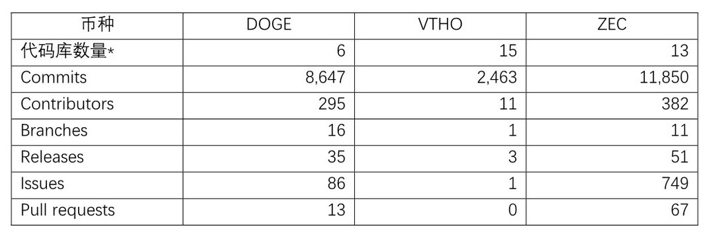 本项比较中,我们引入与DOGE市值相近的VTHO(唯链的第二代币)和ZEC(大零币)作为对比,三者在Github的核心数据对比如下。可以看到,VTHO的Github相关数据优于VTHO,但逊于ZEC。