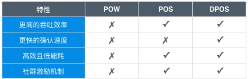 Cocos-BCX 中,所有的预定见证人都由所有的持股人从见证人中投票选举,预定见证人统称为活跃见证人,活跃见证人数量通常为 11~21 个。所有的活跃见证人在 DPOS 共识算法的见证人预定算法中具有相同的出块预定概率,这保证了所有见证人的出块概率和获取出块奖励是一致的。石墨烯投票更新时间通常为 24小时,但处于安全性、稳定性、公平性的考虑,项目初期网络投票更新时 间通常较短,可能为 12 小时甚至更短。 在 DPOS 算法中通过预定见证人和规定时间槽位来推测区块的生产者以及出块时间,主链的活 跃见证人总是多于支链,故此主链区块高度一定高于支链,同时全网投票机制避免了见认证人集中化,保证了网络的安全性,不同见证机制之间的优劣对比如图下所示。