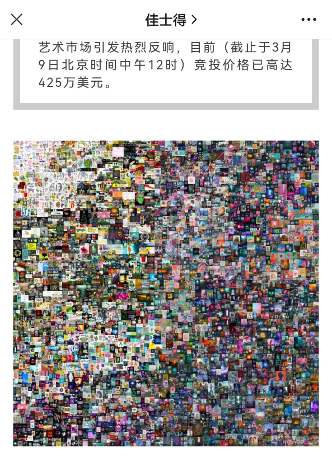 当NFT遇上艺术品,一张图片、一首歌、一段视频,甚至一个头像都可以与一串代码“擦出火花”,身价发生几何倍数暴涨,突破现实世界认知。 NFT全称为Non-Fungible Tokens,即“非同质化代币”。 “从技术上来看,NFT是一种基于区块链技术的契约的数字化凭证。”中国电子技术标准化研究院区块链研究室主任李鸣告诉记者, NFT具有可验证、唯一、不可分割和可追溯等特性,可以用来标记特定资产的所有权。 今年以来,明星、大V、企业纷纷打造推出自己的NFT产品,数字艺术品俨然成为NFT落地最快的应用场景之一。 当“万物皆可NFT”,这串连接虚拟与现实的“神秘代码”,会成为通往元宇宙世界的关键密钥,还是又一场币圈和资本炒作下的零和游戏?很多问题需要提前思考。 NFT走红“出圈” 今年3月,在佳士得拍卖行,NFT数字艺术品《每一天:前5000天》拍出6934万美元(约合4.5亿人民币),刷新数字艺术品成交记录的同时,也让NFT这个词强势闯入大众视野。