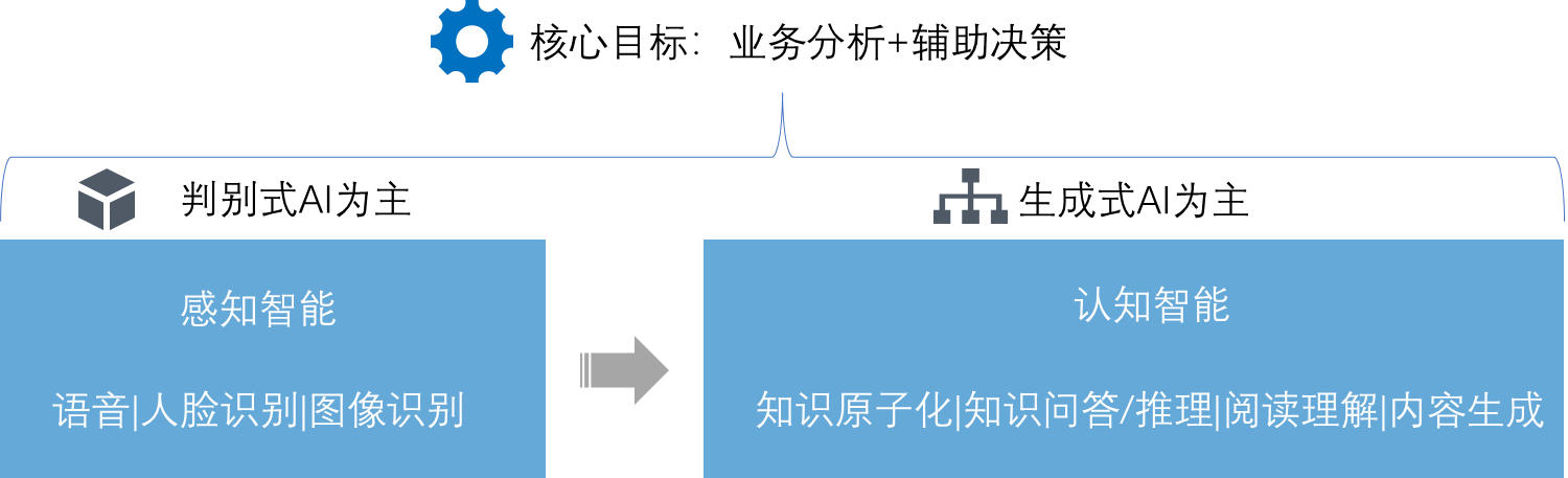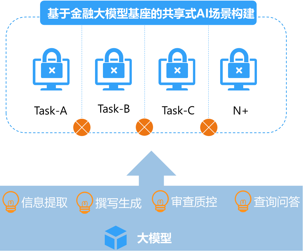 图1:金融大模型基座 与传统AI技术相比,提供金融大模型基座有如下好处: 1.AI能力统一构建 以往,基本上每项下游任务都需要分别建立AI模型,模型之间可复用性和迁移性非常差,从而导致运营维护成本高。大模型则能够下游需要的各类能力进行统一和聚合,包括信息提取、文稿写作、智能问答、多模态生成、分类预测等,管理难度极大地下降。 2.场景快速拓展 基于金融大模型基座,业务场景根据其应用目标和流程拆解后,可以基于一个大模型的下游任务能力快速适配,从而提升了场景开发的效率。 3.业务运营高效 大模型带来“Fine-Tuning+Prompt”的新范式,通过提示工程,就可以“激发”大模型能力,从而让其适配下游任务。此过程中,无需改变模型参数,也无需写代码,具备一定的业务知识和方法论即可,这在以往也是无法想象的。 (二)场景应用大模型,打造“专才能力” 利用垂域数据为金融领域构建应用,以场景应用为突破口在细分领域加强化自己的“护城河”。其总体趋势为从“感知智能”跨越到“认知智能”: