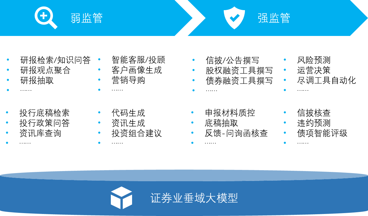 图3:垂域金融大模型应用-证券行业应用趋势 如图3所示,其实金融大模型在证券行业的应用发展趋势可以分成2个阶段来看:弱监管和强监管。当然这两者只是相对而言,实际上都要受到证监会、交易所等相关监管机构的监督和管理。 大模型在证券业的落地应用首先发生在弱监管领域,包括研报检索、研报观点聚合、研报知识问答、投行政策库查询、投行底稿知识问答、智能客服、代码生成、资讯生成等。为何大模型会首先应用在这个领域呢?因为大模型本身会有“幻觉问题”,且即使在这里领域大模型“犯错”了,其受到的“惩罚结果”相对比较轻,而人工控制力度也相对充足。 在强监管域,行业还是保持相对谨慎的态度,处于试错求证的阶段居多,但也是未来不可逆转的落地趋势,因为此领域恰恰是证券公司的主营业务,基于大模型来降本增效是永恒主题。其应用可包括投行文档智能抽取、智能生成、智能核查等。 四、落地金融大模型的研究 落地金融大模型的研究,其实涉及到大模型选择、算力配置、下游任务设计等各个方面。广发证券应用金融大模型,研究投行文档智能一体化处理方案。具体思路如下: