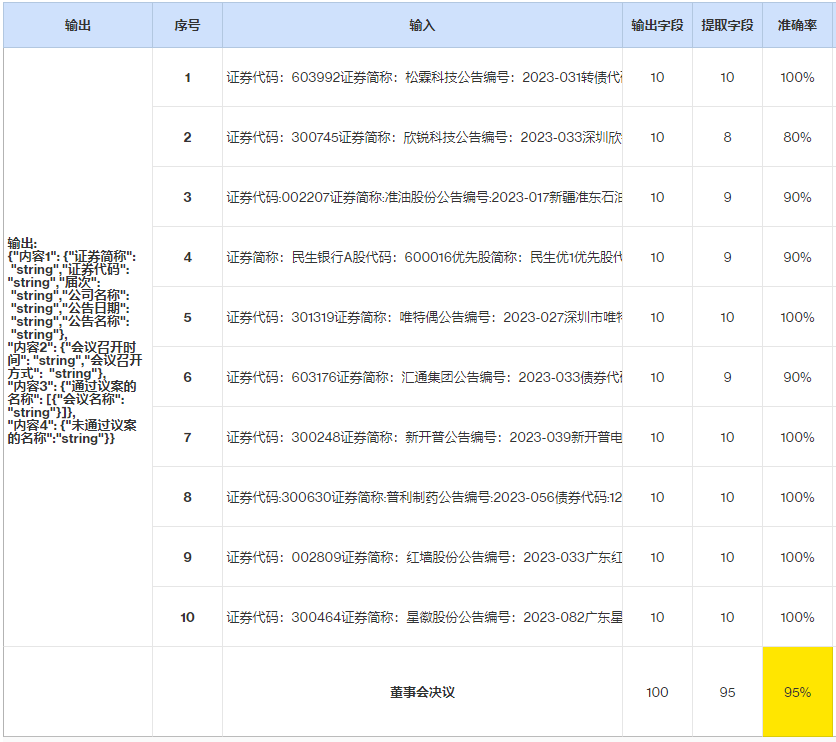 图5:语料工程设计 其中比较核心的就是在tokenize时,做好向量分割、向量嵌入和计算。此外存在公告token超出的模型输入限定的情况,因此还要做好token拼接工作,保障大模型能够正确理解同一份公告的上下文语义。 接下可面向下游提取任务设计提示工程,让大模型能够正确提取相关信息,以公开数据《松霖科技:关于第三届董事会第一次会议决议公告》为例: 1.输入样例: 《松霖科技:关于第三届董事会第一次会议决议公告》 2.输出要求: { "内容1": {"证券简称": "string","证券代码": "string","届次": "string","公司名称": "string","公告日期": "string","公告名称": "string"}, "内容2": {"会议召开时间": "string","会议召开方式": "string"}, "内容3": {"通过议案的名称": [{"会议名称": "string"}]}, "内容4": {"未通过议案的名称":"string"} } 3.提示工程 提示示例: 【你是一个提取结构化信息的机器人,你的目标是匹配输入与输出中每个描述相符合的信息,并按JSON格式输出结构化提取信息。在提取信息时,不要添加任何没有出现在输出中显示的属性。除了提取的信息外,不要输出任何内容,不要添加任何澄清信息,不要添加任何不在模式中的字段。如果文本包含架构中未出现的属性,请忽略它们。】 4.样本集评估