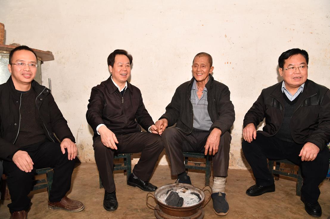 新春佳节前夕,市委书记、市人大常委会主任刘有明(左二)在天等县驮堪乡南岭村看望慰问特困党员劳永珠(右二),送上党委、政府的新春问候与祝福。 本报天等讯(记者 农超武) 1月23日下午,市委书记、市人大常委会主任刘有明深入天等县,看望慰问道德模范、特困党员、五保户、诚信计生贫困家庭,向他们致以新春的祝福。刘有明强调,各级各部门要切实关注困难群体的生产生活,特别要关心困难党员的工作生活,把各项政策措施落实到位,把各项工作具体到困难群众最关心、最需要、最期盼的事情上,让困难群众切实感受到党和政府的温暖,度过一个欢乐、祥和的春节。 刘有明首先看望慰问了2018年市级道德模范梁英瑛。刘有明关切地询问她的工作、生活和家庭情况,感谢她为社会作出的贡献。同时勉励她要珍惜荣誉、再接再厉,继续奉献爱心,继续扩大寻亲志愿者协会力量,帮助更多家庭实现团圆梦,在培育和践行社会主义核心价值观中作表率、当先锋。 “春节准备到了,我代表市委市政府来看看你们,向你们拜个早年。”在驮堪乡南岭村,刘有明先后看望了诚信计生贫困家庭冯永?患摇⑻乩У吃崩陀乐椤⑽灞;я?鼙龊驮谥按甯伞T谔乩У吃崩陀乐榧抑校?跤忻飨晗噶私馄渲吕г?颉!肮?ツ忝俏?澈腿嗣褡隽撕芏喙ぷ鳎?澈驼??换嵬?悄忝牵 绷跤忻鞴睦?陀乐橐?岫ㄐ判模?绞ぴ菔钡睦?选A跤忻魍?倍V鱿喙夭棵乓?涫岛酶飨畋U险?撸?美?讶禾逭媲懈惺艿降澈驼??奈屡?� 在南岭村村委,刘有明与在职村干一一亲切握手,刘有明动情地说:“你们长年在基层,直接跟基层群众打交道,直面基层各种困难和问题,非常辛苦,但你们毫无怨言,一直尽职尽责做好大量细致而卓有成效的工作,让南岭村的养牛业蓬勃发展起来,为南岭村的脱贫攻坚和各项事业发展作出了应有贡献,党和政府感谢你们。”新的一年新的起点,刘有明希望南岭村在职村干要团结协作,心往一处想、劲往一处使,充分发挥好基层党组织战斗堡垒作用,做好脱贫攻坚、乡村振兴等各项发展工作,团结并带领群众发展生产、增加收入,共创和谐富裕的南岭村,为全市脱贫攻坚贡献力量。 市政协副主席、天等县委书记吴强参加慰问。
