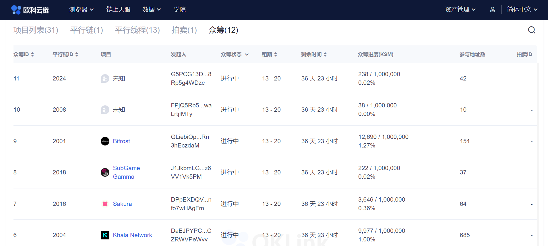另外,在Kusama頁面下方的列表欄,點擊“眾籌”,可以看到參與拍賣的各項目的眾籌進度,通過數據來判斷,哪個項目更有可能拍下插槽。