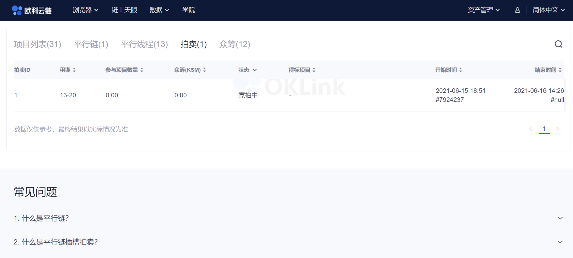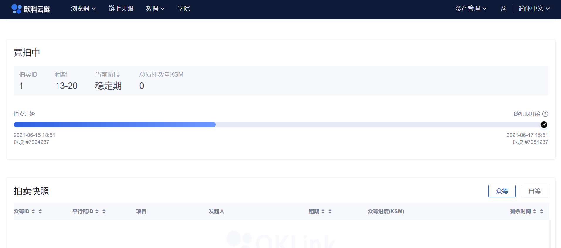 Kusama網路還內置了籌款系統——crowdloan(眾貸)。一些團隊可以選擇使用 Kusama 內置的 crowdloan 來眾籌他們的插槽租賃,用戶可以鎖定自己的 KSM 直到插槽租期結束,來幫助看好的團隊贏得平行鏈,項目方為了鼓勵用戶把代幣借給自己,通常也會採取一些激勵措施,比如把項目代幣分發給眾貸用戶。 關於Kusama拍賣、平行鏈、勝出規則等細則,歐科雲鏈OKLink的波卡生態頁面也提供了詳細、通俗的解釋。 競拍數據全直播 針對此次行業矚目的Kusama插槽拍賣,歐科雲鏈OKLink佈局在先,提供了“實時直播”功能。 在歐科雲鏈OKLink的波卡生態頁面,可以看到Kusama的“競拍直播”資訊——OKLink提供了當前的拍賣ID、租期、總質押數量KSM、區塊等資訊。 同時,OKLink還提供了“直播回放”——拍賣快照功能,可以對“隨機結束期”的每個塊進行快照記錄。