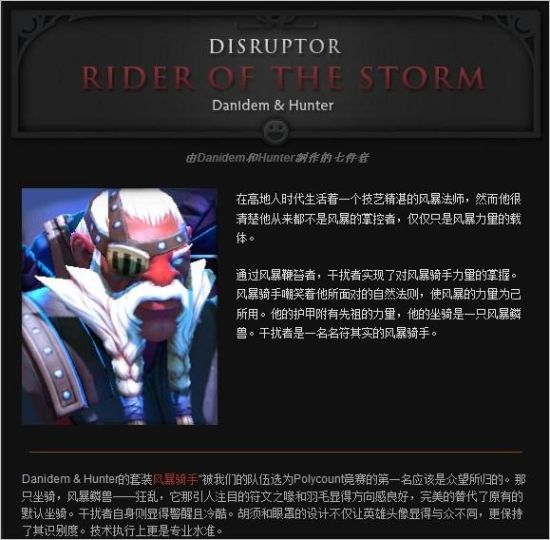 Danidem & Hunter的套装风暴骑手“被我们的队伍选为Polycount竞赛的第一名应该是众望所归的。那只坐骑,风暴鳞兽——狂乱,它那引人注目的符文之喙和羽毛显得方向感良好,完美的替代了原有的默认坐骑。干扰者自身则显得警醒且冷酷。胡须和眼罩的设计不仅让英雄头像显得与众不同,更保持了其识别度。技术执行上更是专业水准。