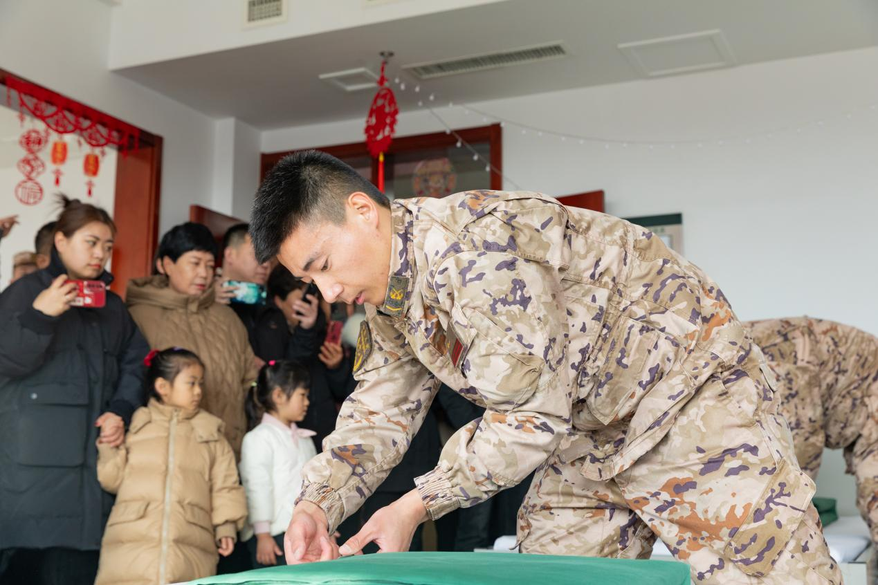 “豆腐块”被子是怎么叠成的?官兵为家长们准备了一场内务展示。他们拿出最高标准,认真细致地展、压、捏、折、修……这一场面不仅让家属们赞叹军人的高标准,更让他们为孩子们的成长点赞。 荣誉共享,沉甸甸的军功章 邀请官兵家属参加颁奖典礼就是要让军功的光芒成为全家的荣光。仪式现场庄严又喜庆,32名受邀参加仪式的家属,不远千里从辽宁、湖北、湖南等9个省份专程来到支队,一起见证荣耀时刻,脸上乐开了花。