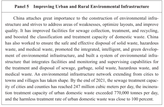 dealing with heavy air pollution have achieved remarkable results. The average PM2.5 density of China’s cities at prefecture level and above dropped from 46 micrograms per cubic meter in 2015 to 30 micrograms per cubic meter in 2021. On 87.5 percent of the days in 2021, people en- joyed good air quality. China is making the fastest progress in air quality improvement. With an accelerated pace in curbing industrial, agricultural and domestic pollution sources, and in regulating water ecological sys- tems, China has significantly reduced seriously polluted water bodies and sub-standard water bodies, and the safety of drinking water is ensured. In 2021, the proportion of surface water at or above Grade III in the country’s five-tier water quality system reached 84.9 percent. China has banned the import of foreign waste, fulfilling its goal of “zero import” of solid waste while basically bringing the threat of soil contamination under control. Brilliant blue skies are dotted with white clouds during the day; when the sun sets, twinkling stars pattern the firmament. The shores are Panel 5 Improving Urban and Rural Environmental Infrastructure China attaches great importance to the construction of environmental infra- structure and strives to address areas of weaknesses, optimize layouts, and improve quality. It has improved facilities for sewage collection, treatment, and recycling, and boosted the classification and treatment capacity of domestic waste. China has also worked to ensure the safe and effective disposal of solid waste, hazardous waste, and medical waste, promoted the integrated, intelligent, and green develop- ment of environmental infrastructure, and built a system of environmental infra- structure that integrates facilities and monitoring and supervising capabilities for the treatment and disposal of sewage, garbage, solid waste, hazardous waste, and medical waste. An environmental infrastructure network extending from cities to towns and villages has taken shape. By the end of 2021, the sewage treatment capac- ity of cities and counties has reached 247 million cubic meters per day, the incinera- tion treatment capacity of urban domestic waste exceeded 770,000 tonnes per day, and the harmless treatment rate of urban domestic waste was close to 100 percent. green and the waters are clean, with fish gliding under the clear water. People are breathing fresher air, drinking cleaner water, and eating safer food. Living in a beautiful environment, people can truly feel the happi- ness and beauty brought about by eco-environmental conservation. III. Adjusting and Improving the Industrial Structure China is committed to the philosophy of innovative, coordinated, green, open and shared development, and takes innovation-driven de- velopment as the driving force to create new momentum and build new strengths for economic development. China has placed rigid constraints on the exploitation of resources and the environment to promote compre- hensive adjustment of the industrial structure, and strengthened regional cooperation to optimize the spatial configuration of industry. As a result, China’s economy has registered a steady improvement in the quality of development while maintaining a reasonable pace of growth. 1. Vigorously developing strategic emerging industries China implements the innovation-driven development strategy. It takes scientific and technological innovation as the driving force and guarantee for adjustment of industrial structure and green and low-carbon transition of the economy and society and regards strategic emerging in- dustries as a key driver for economic development, reaping remarkable economic and social benefits as a result. China has intensified investment in scientific and technological innovation. The nation’s gross domestic research and development (R&D) spending grew from RMB1.03 trillion in 2012 to more than RMB2.8 trillion in 2021. Its R&D spending intensity, or the expenditure on R&D as a percentage of its GDP, rose from 1.91 percent in 2012 to 2.44 percent in 2021, approaching the average level of the Organization for Economic Cooperation and Development (OECD) countries. Chinese enterprises’ investment in R&D has continued to increase, accounting for more than 76 percent of the country’s total R&D investment. By the end of 2021, China’s energy conservation and environmental protection industry owned 49,000 valid invention patents, and the new energy industry held 60,000, 1.6 and 1.7 times more than in 2017. From 2011 to 2020, the number of patent applications filed by China for environment-related technology inventions was close to 60 percent of the world total, making it the most active country in environmental technology innovation. Emerging technologies have become the main props of China’s eco- nomic development. Thanks to accelerated efforts to implement emerg- ing technologies such as artificial intelligence (AI), big data, blockchain, and quantum communication, new products and business forms including intelligent terminals, telemedicine, and online education have been culti- vated, and their role in boosting growth has continued to increase. China’s digital economy ranks second in the world. During the 13th Five-year Plan period (2016-2020), the average annual growth rate of the added value of information transmission, software and information technol- ogy services reached 21 percent. The internet, big data, AI, 5G and other emerging technologies are deeply integrated with traditional industries, facilitating the integration of advanced manufacturing with modern ser- vices. The value-added output of high-tech and equipment manufacturing in 2021 accounted for 15.1 and 32.4 percent of that of industries above designated size, up 5.7 and 4.2 percentage points from 2012 respectively. China is on the way to realize the transformation and upgrading from “made in China” to “intelligent manufacturing in China”. China’s