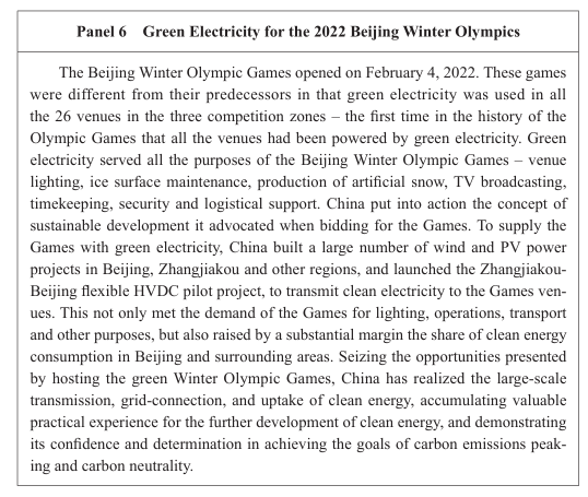 is an area that deserves more attention in the pursuit of green develop- ment. By upgrading the energy efficiency of transport equipment, China has accelerated the building of a green transport network, with optimizing the structure of energy consumption and improving the efficiency of or- ganization as its priorities, so that transport will be more eco-friendly, and travel will be more low-carbon. Optimizing the structure of transport. China has accelerated the con- struction of special railway lines, promoted the shift of freight transport from road to railway and waterway, and encouraged intermodal transport. In 2021, the railway and waterway freight volume accounted for 24.56 percent of the total in China, an increase of 3.85 percentage points over Panel 6 Green Electricity for the 2022 Beijing Winter Olympics The Beijing Winter Olympic Games opened on February 4, 2022. These games were different from their predecessors in that green electricity was used in all the 26 venues in the three competition zones – the first time in the history of the Olympic Games that all the venues had been powered by green electricity. Green electricity served all the purposes of the Beijing Winter Olympic Games – venue lighting, ice surface maintenance, production of artificial snow, TV broadcasting, timekeeping, security and logistical support. China put into action the concept of sustainable development it advocated when bidding for the Games. To supply the Games with green electricity, China built a large number of wind and PV power projects in Beijing, Zhangjiakou and other regions, and launched the Zhangjiakou- Beijing flexible HVDC pilot project, to transmit clean electricity to the Games ven- ues. This not only met the demand of the Games for lighting, operations, transport and other purposes, but also raised by a substantial margin the share of clean energy consumption in Beijing and surrounding areas. Seizing the opportunities presented by hosting the green Winter Olympic Games, China has realized the large-scale transmission, grid-connection, and uptake of clean energy, accumulating valuable practical experience for the further development of clean energy, and demonstrating its confidence and determination in achieving the goals of carbon emissions peak- ing and carbon neutrality. 2012. China has also emphasized the strategy of giving priority to urban public transport. By the end of 2021, there were 275 urban rail transit lines in operation in 51 cities, with a total track length of more than 8,700 kilometers. The length of exclusive bus lanes increased from 5,256 kilo- meters in 2012 to 18,264 kilometers in 2021. Promoting the green transformation of transport vehicles. China has vigorously promoted the use of new-energy vehicles in public trans- port, taxi service, environmental sanitation, logistics, distribution, civil aviation, airports, and Party and government institutions. By the end of 2021, the number of China’s registered new energy vehicles had reached 7.84 million, accounting for about half of the global figure. There were 508,900 new energy buses, accounting for 71.7 percent of the total num- ber of buses in China. There were 207,800 new energy taxis. China has continued the green transformation of mobile railway equipment. The proportion of internal combustion locomotives decreased from 51 percent in 2012 to 36 percent in 2021. China has also updated the pollutant dis- charge standards for motor vehicles, promoted the use of liquefied natural |