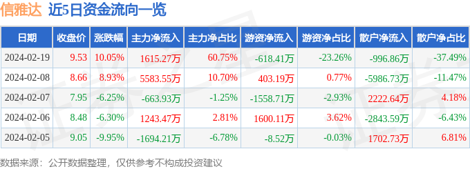 证券之星消息,信雅达涨停收盘,收盘价9.53元。该股于9点25分涨停,未打开涨停,截止收盘封单资金为4.29亿元,占其流通市值10.11%。 2月19日的资金流向数据方面,主力资金净流入1615.27万元,占总成交额60.75%,游资资金净流出618.41万元,占总成交额23.26%,散户资金净流出996.86万元,占总成交额37.49%。 近5日资金流向一览见下表: