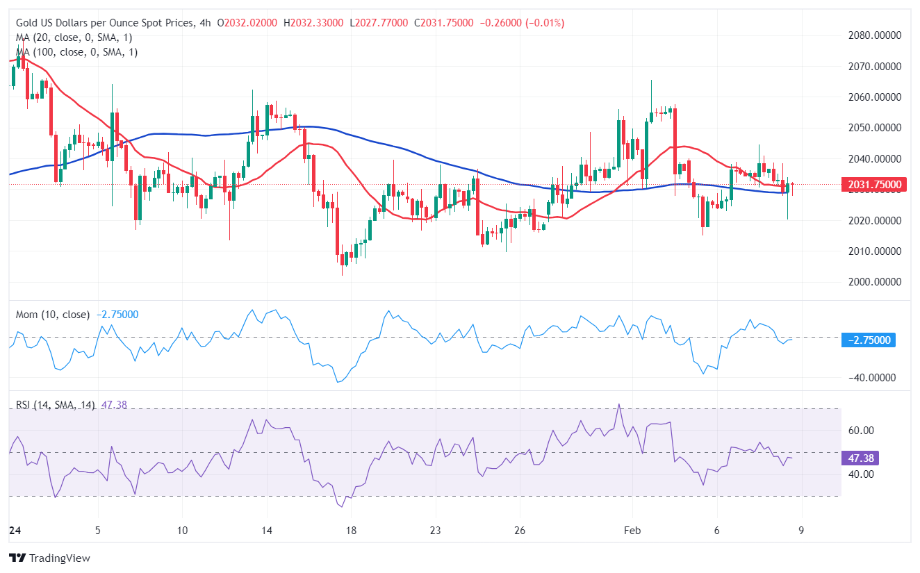 周五(2月9日)亚市早盘,现货黄金在经过隔夜剧烈波动之后,金价目前交投在2033美元/盎司附近。FXStreet首席分析 周五(2月9日)亚市早盘, 现货黄金 在经过隔夜剧烈波动之后,金价目前交投在2033美元/盎司附近。FXStreet首席分析师Valeria Bednarik撰文,对黄金技术前景进行分析。Bednarik写道,金价周四走势波动,但在收盘时没有提供方向性线索。金价回到2030美元/盎司区域附近波动。 周四欧市盘中, 现货黄金 一度攀升至2038.49美元/盎司,但随后金价开始走低,在美国初请失业金人数数据公布后,金价曾逼近2020美元/盎司关口。不过,随后金价展开强势反弹,最终周四收报2034.28美元/盎司,当日微跌0.04%。