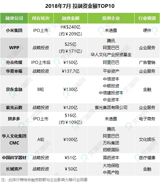 小米集团于本月9号在港上市,引发行业强力关注。 小米在公司成立第八年成功上市,市值一度突破5000亿,小米创始人雷军身价也超越李彦宏、刘强东等人。小米最初选择最激烈的手机行业作为切入点,用了三年的时间做到中国第一。早年小米通过顺为加小米生态链组合打法投下的近百家小米生态链企业,也已经逐渐成为小米在新零售领域的"护城河"。 本月阿里巴巴、腾讯与华人文化产业投资基金(CMC)购买全球最大广告传播集团WPP中国业务20%的股份,预期业务估值在20亿到25亿美元之间,市销率杠杆达到1.33-1.67倍。 根据未来资本市场的长期表现来看,阿里和腾讯的此番入股行动对于本土营销企业是极大的利好,营销上市公司的企业市值也可能迎来被重估的好契机。 7月18日,分众传媒收到阿里网络的通知,与Power Star (HK)、Glossy City(HK)于2018年7月17日共同签订了《股份转让协议》,约定阿里网络通过协议转让的方式受让Power Star (HK)及Glossy City(HK)所持分众传媒合计7.74亿股股份,占公司总股本的5.28%。今日分众传媒发布了与阿里网络签署框架协议公告,称双方未来将在广告系统服务、人脸识别技术、OTT智能电视广告三大领域进行业务上的合作。 其余几名分别为华夏幸福、京东金融、紫光云数、拼多多、华人文化集团CMC、中国科学器材、长城资产,其中拼多多的上市尤为瞩目,被誉为"新电商时代的到来"。 "明星"赛道