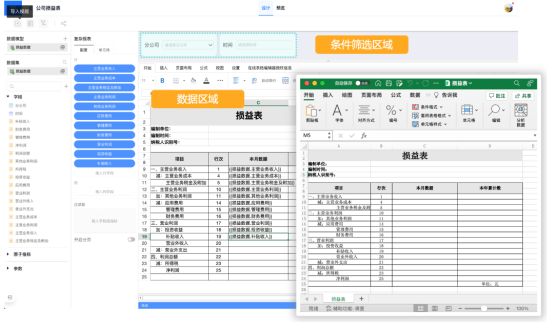 (图:5.0版本可视化图表支持多级联动) 5.0新版本的另一大更新是在4.5版本推出的复杂报表功能基础上,进一步迭代了复杂报表应用,进一步降低报表使用门槛。报表应用的界面能够与Excel高度兼容,用户能够以所见即所得的方式直接进行报表操作,更贴合报表用户使用习惯。 在功能布局上,5.0版本的报表分为条件筛选区域和数据区域两部分,前者可让用户便捷地进行条件筛选与参数过滤,后者则能呈现业务数据。报表应用还支持导入Excel模板,在模板上快速开发。同时,5.0版本中报表应用增加二维码展示、图片识别、分页开关等功能。