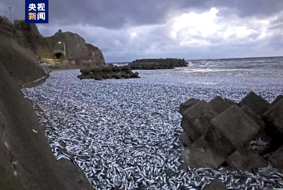 △图片来源:HTB北海道新闻 日本广播协会电视台去年12月7日曾报道,北海道函馆市一海滩上出现大量死亡的沙丁鱼等鱼类。