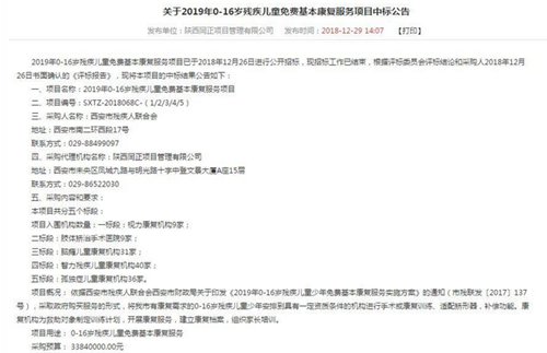 近日,由陕西省政府采购网获悉,西安市中医医院中标2019年0-16岁残疾儿童免费基本康复服务项目(SXTZ-2018068C-3),将在2019年开展脑瘫儿童康复服务项目。 依据西安市残疾人联合会西安市财政局关于印发《2019年0-16岁残疾儿童少年免费基本康复服务实施方案》的通知(市残联发〔2017〕137号),采取政府购买服务的形式,将我市有康复需求的0-16岁残疾儿童少年安排到具有一定资质条件的机构进行手术或康复训练、适配矫形器,补偿功能。