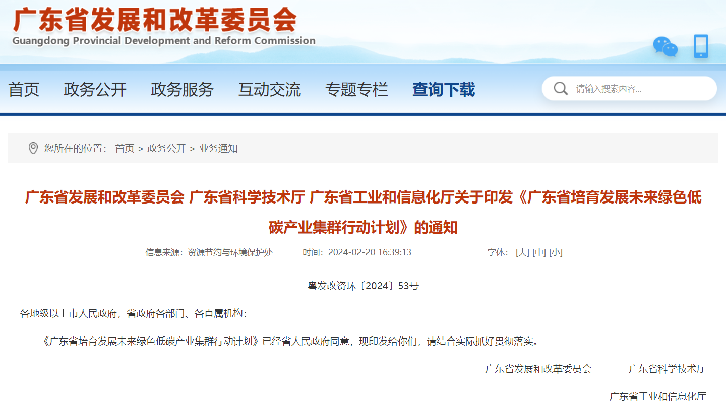 2月20日,广东省发展和改革委员会 广东省科学技术厅 广东省工业和信息化厅发布关于印发《广东省培育发展未来绿色低碳产业集群行动计划》的通知。