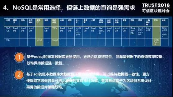第四,账本数据库是储存账本数据的模块,在生产环境中更多使用非关系型的KV键值对数据库。在海量数据下,非关系型数据库高并发写入性能高,但查询效率较低,很难满足链上的数据查询和数据分析需求。这种情况下,Mysql等关系型数据库的查询能弥补查询效率的不足。因此有些厂商部署一条链,通过NoSQL进行实时存储,同时,又将数据同步存储在SQL数据库中,方便进行查询和数据分析。