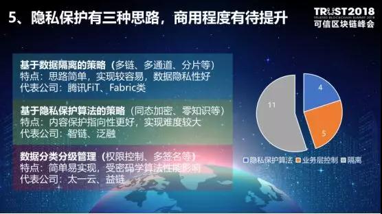 第五,隐私保护,包括三个思路。 第一个是隔离,是通过多链、多通道以及分片实现,思路比较简单,实现较容易,隐私保护性好,代表公司像腾讯FiT是用多链技术,Fabric类用的是多通道。 第二是隐私保护算法相关的策略,包括同态加密、零知识证明等。同态加密,现在可以商用的是加法同态运算,用到乘法时占用空间太大,执行起来效果不是太理想。 第三是数据分类分级管理,通过多签名,通过权限管理,进行数据隐私保护的管控。
