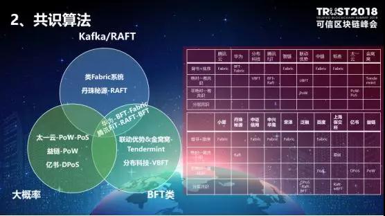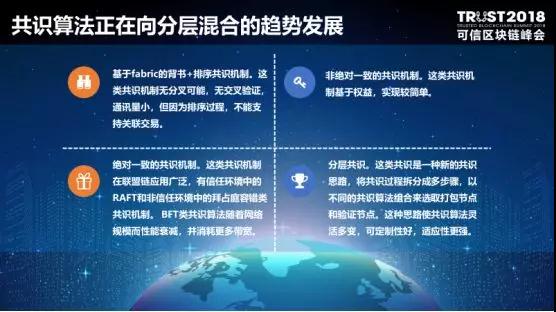 第二,共识算法方面,分为去信任的环境和信任的环境两大类。在Fabric类系统中,都是通过背书节点预运行,通过Kafka进行数据同步,最后通过排序节点进行统一处理,实现状态管理。在这种情况下,没有分叉的可能性,也没有交叉验证,但是存在脏数据,一旦涉及关联交易,不能并行处理,因此性能较差。另外,Fabric的容错率主要取决于背书策略的选取。 大概率一致共识算法,在部署前期存在冷启动的困境,要保证最开始的阶段不能让一个节点获得所有打包权限,实现的方案可能需要通过一些强制机制进行管理。 绝对一致性的共识,整个环境当中分为信任环境的 RAFT算法和非信任环境的BFT类算法,通过多个节点的消息交互、数据同步之后,保证数据的一致性。区别在于,RAFT只有两轮消息交互,无条件相信Leader。BFT类有三轮消息交互,对Leader发送的交易也会进行质疑。在这种情况下,更容易受到网络抖动、网络规模大小、出块策略等相关因素的影响。 让我们更加惊喜的是,分层共识和混合机制是一个很大的趋势。很多时候是许可链和非许可链、公有链和联盟链的融合。如果是ToC端的,你当然希望公有链能够获得更多的用户,如果对联盟链来说,ToB端的,你肯定希望各自之间会有一定的信任基础。目前,开放许可链、公有私有链都是业界探索的方向。例如,Algorand就是在PoS的基础上,通过随机选择算法(VRF),选择固定数量的节点进行PBFT共识,保证数据的一致性和防篡改、防抵赖特性。