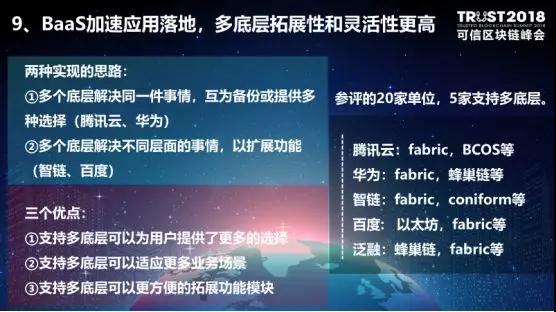 第九,BaaS加速应用落地,多底层拓展性和灵活性更高。第一种实现思路是多个底层平台实现同一个事情。多个底层平台并行做同一个事情,互为备份。另一种实现思路是多底层平台解决不同层面的问题,以扩展系统功能。例如智链用Coniform来面向高性能的交易支付场景,用Fabric来面对低并发的、溯源类的应用场景。 多底层平台为用户提供非常好的平台,降低部署成本,多底层可以适应更多业务场景,更方便拓展功能模块,目前参评的20家单位有5家支持多底层,他们分别是腾讯云、华为、智链、百度和泛融。