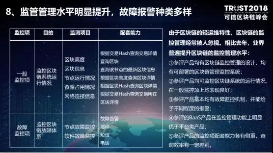 第八,监管水平明显提升,故障报警种类多样。一方面,区块链系统监管包括一些传统的监管模式,包括服务器状态、区块高度、哈希值在区块链中的追溯等。另一方面是故障监控问题,当监测到系统故障,可以通过发邮件、打电话、发微信等方式进行告警。 因为区块链的轻运维、容错性高等特性,许多厂家在去年的时候,都忽略了区块链对运维管理的强需求。让我们惊喜的是,从今年的测试情况来看,大多数厂商都做了故障的分级分类管理,监控环境得到明显提升。生产环境中,优良的运维管理是系统持续运行的重要保障。