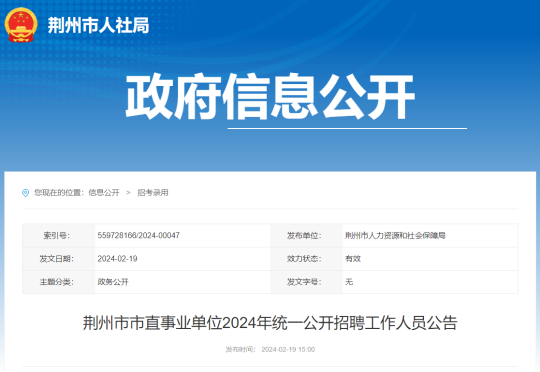 荆州市人社局发布 2024年荆州市市直事业单位 公开招聘工作人员公告 拟面向社会公开招聘388名工作人员 快来看看吧