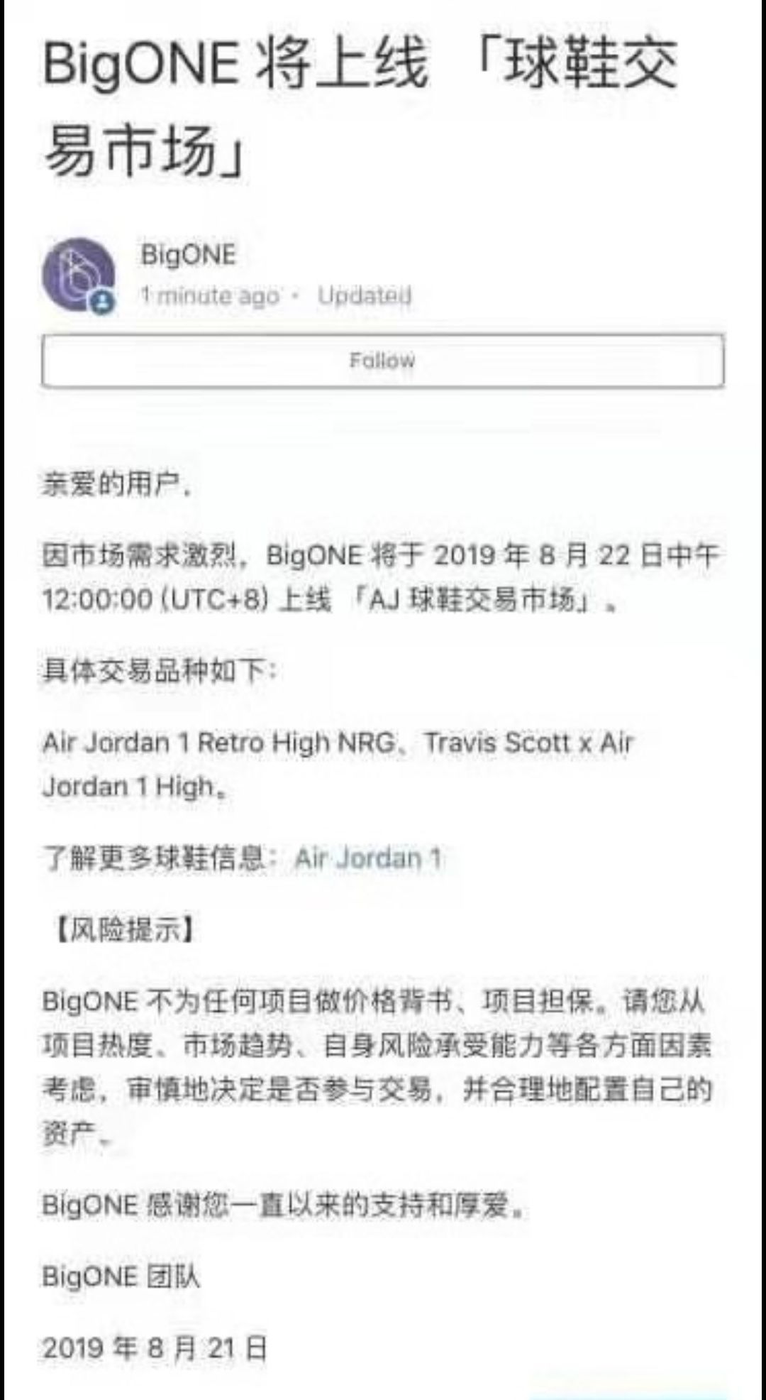根据后者展示的球鞋交易页面显示,它允许币圈投资者使用比特币作为球鞋交易的数字货币工具,在这里,你有多少双鞋子,与你有多少个比特币,多少人民币存款,一起被视为财富的象征。 除了中小型比特币券商对球鞋券商分流币圈资金、用户感到不满,那些未能进入比特币券商三强角色的大型券商,也开始借炒鞋市场吸引用户和资金,这其中就包括比特币首富李笑来所投资的BIGONE。 值得一提的是,李笑来是币圈著名的割韭菜专家,其持有的比特币数量庞大,资产高达70亿,也曾经多次公开炫耀自己就是通过割韭菜来获利,去年 9月,李笑来还出版了《韭菜的自我修养》,半年销量超过 10万册。 而今炒鞋市场火爆一时,一度将炒币市场的热度压了下去,尤其是许多比特币券商平台提供的交易币种都陷入了跑路、骗局、空气等糟糕状态。相对于可能一文不值的山寨币,一双鞋子(哪怕是冒牌鞋)或许还可以使用。 李笑来旗下的BIGON在8月21日发布公告称,因“市场需求强烈”,BIGONE将于2019年8月22日上线球鞋交易市场。具体交易品种包括Air Jordan 1Retro High NRG、Travis Scotto X Air Jordan 1 High。