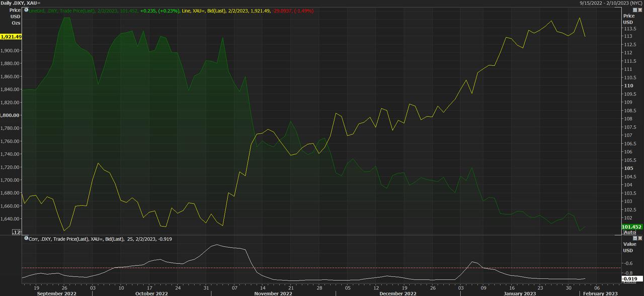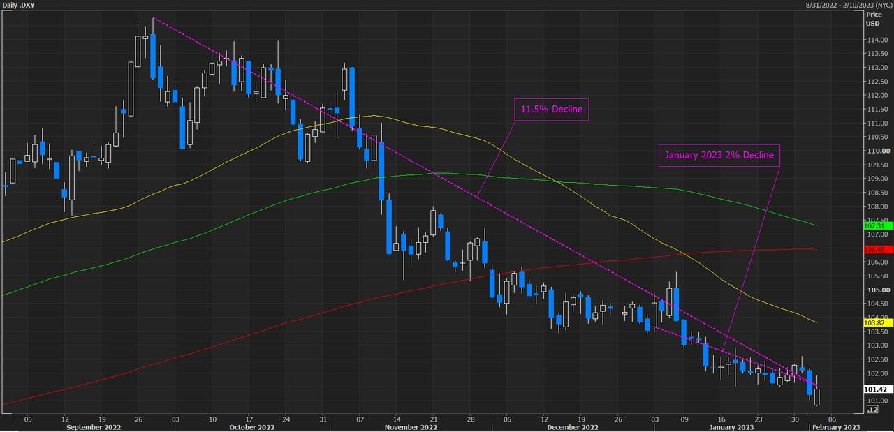 强势美元是2022年国际商业的核心条件之一,对一些最知名的美国公司造成了重大不利影响。然而,美元的强势自9月份以来一直在减弱,而近期央行的决定表明,美元面临的下行压力可能会持续下去。 哪些市场领域将从美元贬值中获益最大?那么,投资者该如何把握这一利好呢? 从历史上看,黄金、大型科技公司和美国大型出口商等领域都受益于美元走软。为了利用这种情况,投资者可以选择适当的股票和ETF,让他们在这些领域有敞口(具体细节稍后再讲)。与此同时,也有直接与汇率变化挂钩的投资工具。 美元贬值 美元指数自9月底见顶以来已经下跌了11.5%,其中1月份下跌了2%。该指数已从9月份的114.78跌至周四盘中的101.50左右。这一回落使得广泛关注的美元强弱指标跌破了50日、100日和200日移动均线。 下面是一张详细描述撤退的图表: