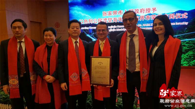 今年2月26日,张家界市举行仪式授予大峡谷玻璃桥设计者渡堂海(右三)张家界市荣誉市民。以色列驻华大使何泽伟(右二)及夫人思佳丽,张家界市委书记虢正贵(左三)、张家界市人大党组书记、副主任余怀民(左二)、张家界副市长欧阳斌(左一)合影