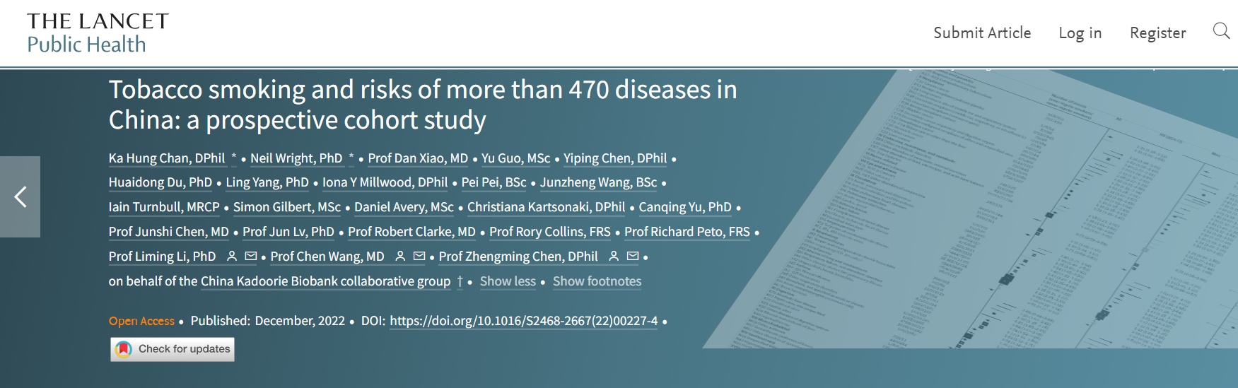 数据显示,20世纪全球因吸烟导致的死亡人数高达1亿人,而预计21世纪全球吸烟所导致的累计死亡人数将达到10亿人,而且其中大部分将发生在包括中国的中低收入国家中。 当前,除极少数在欧美人群中开展的研究以外,迄今在中国和其他中低收入国家并无大型前瞻性队列研究,全面而系统地探讨吸烟与各类不同疾病发病及死亡风险之间的关系。陈铮鸣教授、王辰教授和李立明教授的研究团队,利用《中国慢性病前瞻性研究(CKB)》的数据,系统地分析了吸烟与470多种疾病的发病以及80多种死因的风险关系以及戒烟的益处,研究纳入了512000多名年龄在30至79岁之间的成年人,这些研究对象来自中国5个农村地区和5个城市点,约有33%的人经常吸烟,其中男性吸烟率为74%远高于女性的3%。研究所收集的基线数据包括详细的吸烟信息(例如开始吸烟的年龄、每天吸烟量,烟草类型以及戒烟情况),并通过检测呼气一氧化碳浓度客观验证吸烟信息的可信度。 在平均11年的随访期间,研究通过与死亡登记及住院诊疗信息系统链接,共观察记录到48800多例死亡和累计近114万例各类疾病住院事件。在所分析的近85种死亡原因和480种疾病中,吸烟显著增加22种疾病死亡(男性17种,女性9种)和56种疾病发生(男性50种,女性24种)的风险,女性吸烟后相关疾病更为易发。