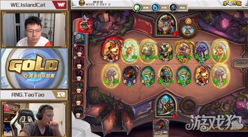 炉宗组第一场比赛是WE对阵RNG战队,主舞台第一局是法师内战,双方都打出了洪流,不过,爱队率先过牌,找到双火球打脸先下一城。第二局是爱队的奥秘骑对阵李神的超生德,骑士前期组织起攻势,德鲁伊4费双雷霆绽放强行铺场,骑士无法全解后被德鲁伊迅速滚起雪球,满场树人持续施压。第三局李神换上法术法,法师持续控场,并且利用双衰变解场了骑士的场面,骑士打空手牌后神抽纳鲁之锤,继续保持场面压力,利用武器抢死了法师。第四局爱队换上突袭战,法师的双洪流来得比较迟,一直未能控住战士的场面,战士稳稳拿下胜利。