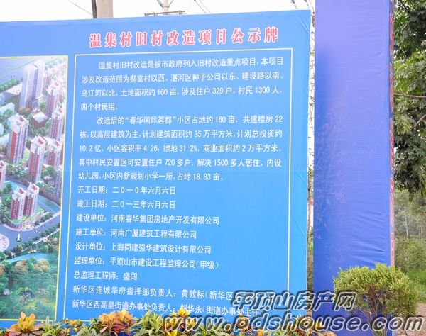 春华·国际茗都,是河南春华集团2010年斥资10亿鼎力打造的平顶山市城中村改造第一形象工程,位于建设西路,城市的核心枢纽区,东连老城区,西临新开发区,独特的地理位置,使温集村成为都市村庄“第一村”,其改造项目成为平顶山城中村改造的“桥头堡”,也被列入2010年平顶山市重点建设工程。