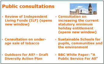 图二 英国访问设定栏目主题设置 尤其在便利技术子主题中,网站设置了3个服务项目,特别为残疾人士提供了极富人性化的服务帮助:更简便的使用电脑、便利的技术产品、英国在线中心。这些服务项目主要帮助残疾人士选择合适的硬件器材、软件平台。其中英国在线中心,不仅提供了大量的便利性技术产品,如为盲人提供上网的语音辅助器材,为身体残疾人士提供特殊的鼠标键盘,同时通过最近的在线中心,用户还可以获得专门的服务人员的个人辅导,顺利的从政府网站获取资讯和服务。 充分的整合既有资源,在清晰、明了的服务框架下为用户提供全面细致的服务,这是欧盟等发达国家先进政府网站的一个共同特点,也是我国政府网站今后发展的方向。除此之外,为用户使用网站设置专栏,帮助用户顺利、有效的获取资讯服务,尤其是对残疾人士,网站不仅提供了大量的针对性服务,更设置了专门的机构中心,就近为其辅导服务,这是英国政府网站发展到今天对以人为本理念的真切体现。 我国政府网站尚处于初始起步阶段,大量的服务项目还处于一个从无到有的发展过程中,要为用户尤其像残疾人士等特定用户群体提供专门的贴身服务还不太现实,但以这种理念作为一种引导,它为我国政府网站今后健康的发展成熟、切实提高网站的服务效率提供了一个参考思路。 四、畅通的政民对话渠道,保障公民参与监督的权利 通过政府网站,丰富政民对话的途径;打造通畅的互动渠道、增进政民沟通;倾听公众的声音,吸纳公众参与到政府决策中去。这是欧盟各国政府网站发展建设的一个重要目标。与之相比,由于我国政府网站在公众参与的主题栏目设置、参与方式、意见反馈、后台处理及制度保障等各方面都还处于摸索发展阶段。这里通过对比分析英国政府门户网站在公众参与、对话式政府网站打造等相关方面的成功经验,可以为我国政府网站今后在打造公畅通的公众参与渠道提供诸多有益的借鉴。 英国政府网站的公众参与主要通过“公共咨询”来实现,如图三所示。在网站组织形式上,它分为信息资源目录导航区,公众咨询主题目录展示区,帮助提示区。总体来说,该栏目的设计有如下特点:
