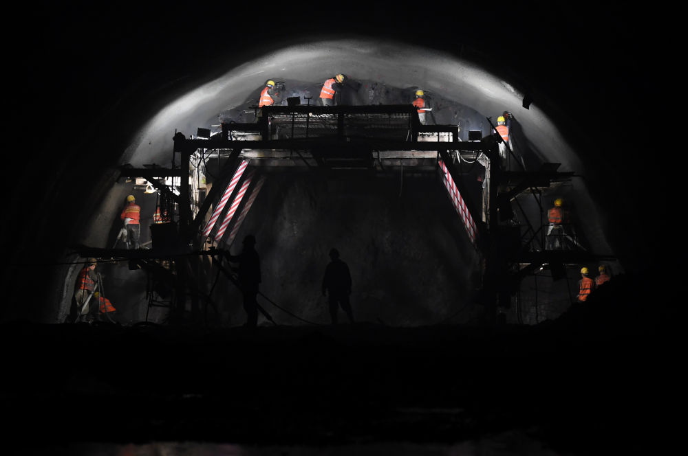 3月15日,中铁十一局施工人员在西十高铁陕西段天竺山一号隧道横洞进行施工作业。新华社记者 李一博 摄