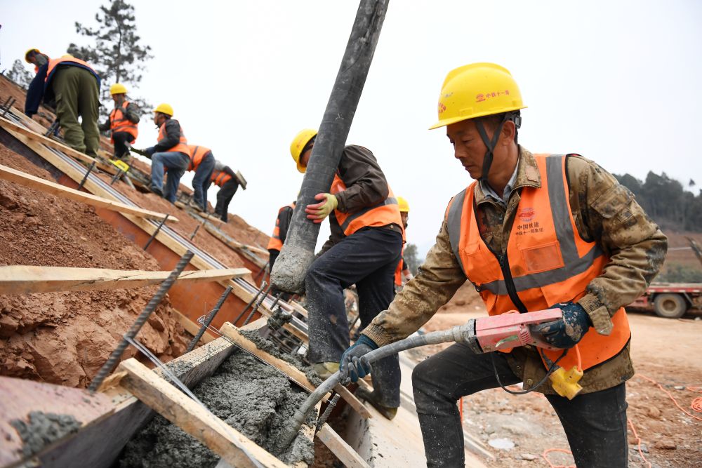 3月15日,中铁十一局施工人员在西十高铁陕西段山阳跨福银高速特大桥工地施工作业。新华社记者 李一博 摄