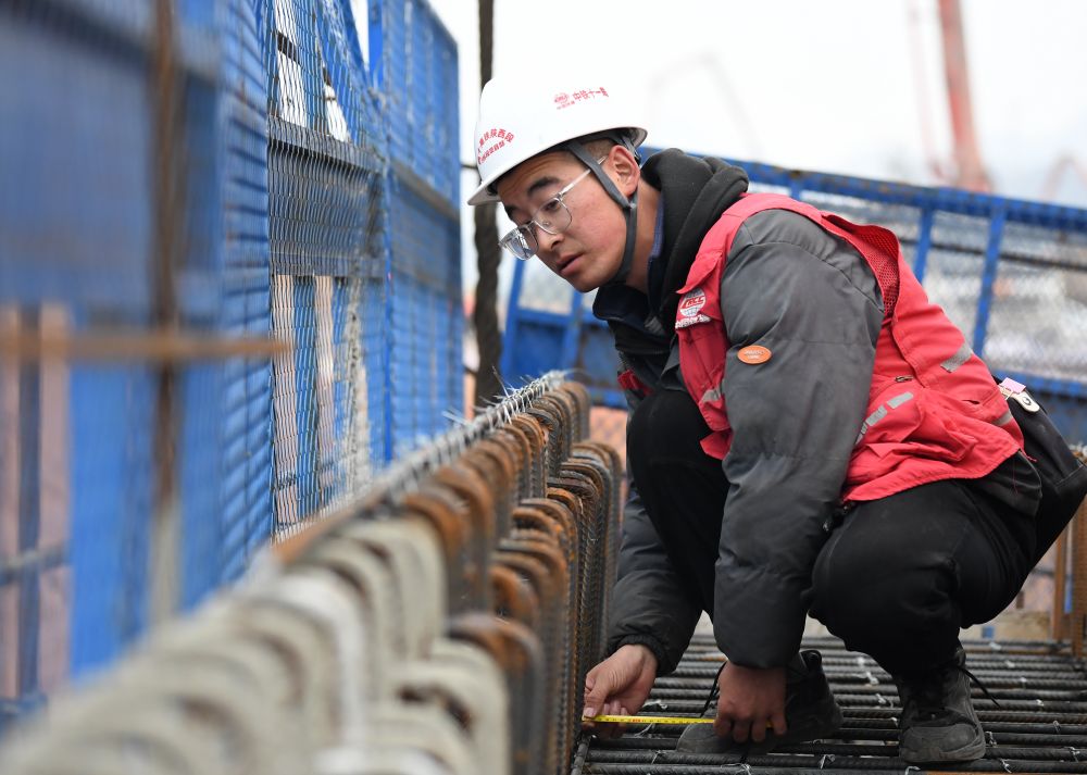 3月15日,中铁十一局技术人员在西十高铁陕西段山阳跨福银高速特大桥工地测量钢筋间距。新华社记者 李一博 摄