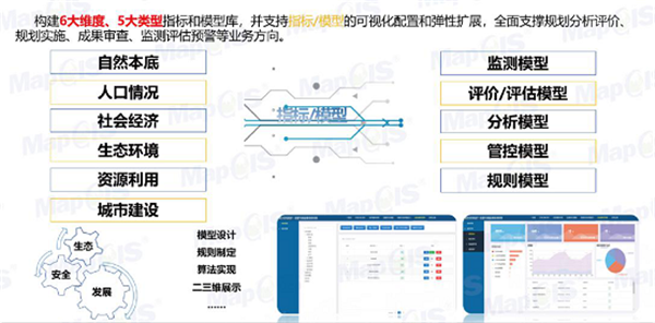 指標/模型中心 圍繞國土安全、生態保護、資源利用、人居環境等維度,結合生態、安全、發展等因素,建立6大維度指標體系,5大類型模型庫,同時支援指標/模型的可視化配置和彈性擴展,全面支撐業務質變,構建指標傳導機制、完善全業務模型體系。