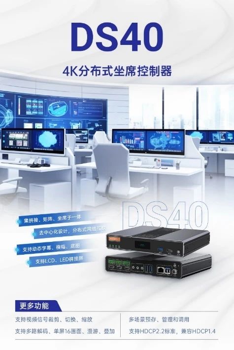 DS40分布式坐席控制器 DS40 4K分布式坐席控制器,是一款充分运用视频压缩处理技术、网络技术、可视化技术、集中控制等先进技术,构建以IP网络为纽带,集视频拼接处理、KVM协作管理、音频处理、集中控制等多种功能及编解码于一体的设备,具有分布式、网络化、可视化、去中心服务器等特点。 海康威视 展位号:PE1-01