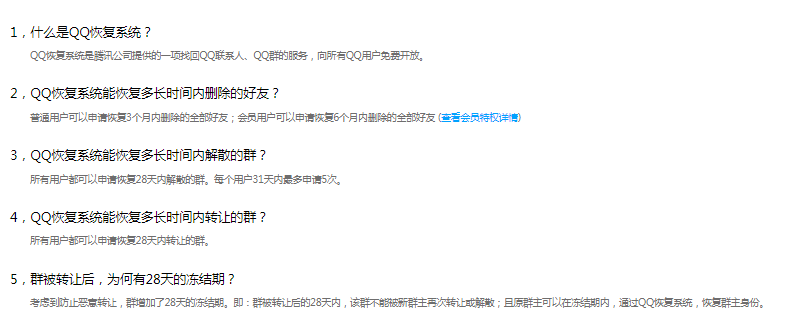 图源:QQ官网 QQ官网页面仍然有“恢复QQ群”功能的相关介绍。QQ恢复系统是腾讯公司提供的一项找回QQ联系人、QQ群的服务,向所有QQ用户免费开放。 所有用户都可以申请恢复28天内解散的群,每个用户3天内最多申请5次,所有用户都可以申请恢复28天内转让的群。 1.什么是QQ恢复系统? QQ恢复系统是腾讯公司提供的一项找回QQ联系人、QQ群的服务,向所有QQ用户免费开放。 2.QQ恢复系统能恢复多长时间内删除的好友? 普通用户可以申请恢复3个月内删除的全部好友;会员用户可以申请恢复6个月内删除的全部好友。 3.QQ恢复系统能恢复多长时间内解散的群? 所有用户都可以申请恢复28天内解散的群。每个用户31天内最多申请5次。 4.QQ恢复系统能恢复多长时间内转让的群? 所有用户都可以申请恢复28天内转让的群。 5.群被转让后,为何有28天的冻结期? 考虑到防止恶意转让,群增加了28天的冻结期。即:群被转让后的28天内,该群不能被新群主再次转让或解散;且原群主可以在冻结期内,通过QQ恢复系统,恢复群主身份。