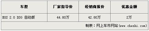 大众eos搭载了2.0 TSI涡轮增压汽油直喷发动机,最大功率为147千瓦,在1800转/分钟的转速范围内能够保持280牛顿?米的最大扭矩。大众汽车新款Eos 2.0 TSI采用前轮驱动,装备六档手动变速箱:百公里加速为7.8秒,最高车速可达232公里/小时;装备6档DSG双离合变速箱:百公里加速时间为7.8秒,最高车速达229公里/小时,提供了极佳的驾乘乐趣与操控体验。